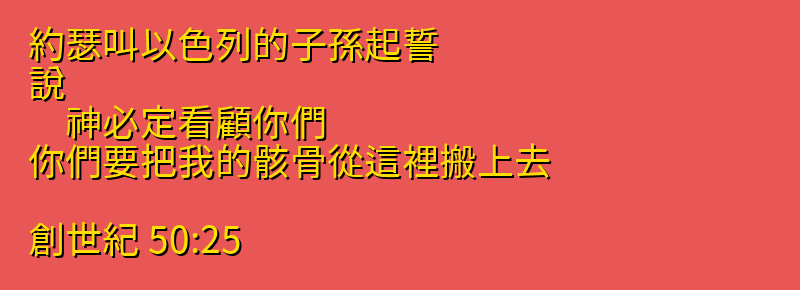 約瑟叫以色列的子孫起誓、說、 神必定看顧你們、你們要把我的骸骨從這裡搬上去。