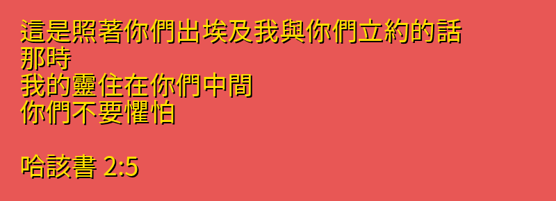這是照著你們出埃及我與你們立約的話.那時、我的靈住在你們中間.你們不要懼怕。