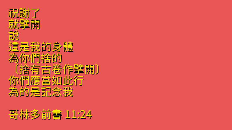 • 11:24 祝謝了、就擘開、說、這是我的身體、為你們捨的.〔捨有古卷作擘開〕你們應當如此行、為的是記念我。