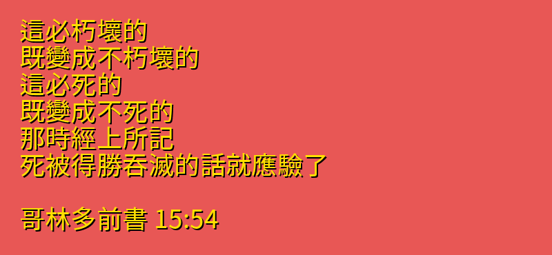這必朽壞的、既變成不朽壞的.這必死的、既變成不死的.那時經上所記、死被得勝吞滅的話就應驗了。