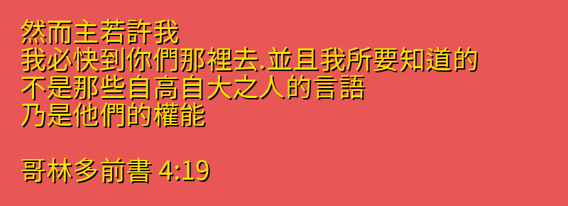 • 4:19 然而主若許我、我必快到你們那裡去.並且我所要知道的、不是那些自高自大之人的言語、乃是他們的權能。