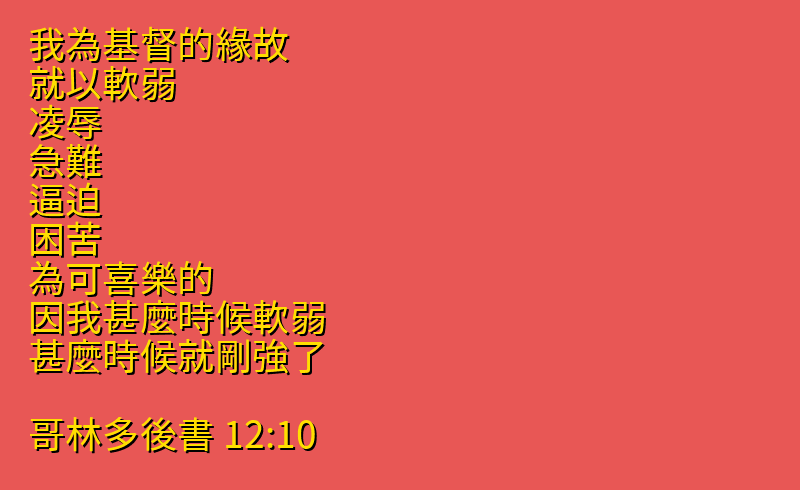 我為基督的緣故、就以軟弱、凌辱、急難、逼迫、困苦、為可喜樂的.因我甚麼時候軟弱、甚麼時候就剛強了。