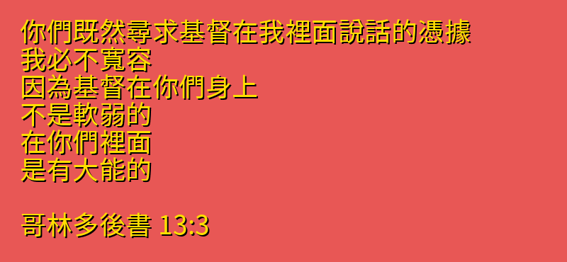 你們既然尋求基督在我裡面說話的憑據、我必不寬容.因為基督在你們身上、不是軟弱的.在你們裡面、是有大能的。