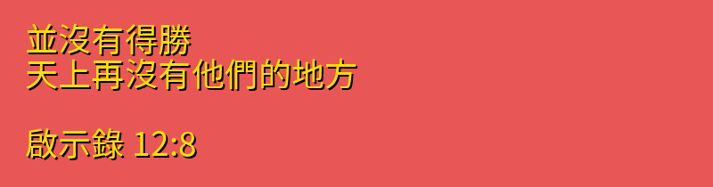 今日分享的中文聖經:「並沒有得勝、天上再沒有他們的地方。」來自聖經「啟示錄」第「12章8節」,你可以繼續向下拉看到聖經卷書完整章節。每日中文聖經從神的話語中聆聽神的聲音,引導我們的人生,指導我們人生的方向,讓我們做出正確的選擇,而做出這些正確選擇的原則都在聖經中,所以我們需要讀神的話語,認識他的話語,把神的話語藏在心裡。