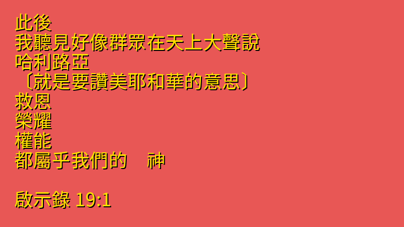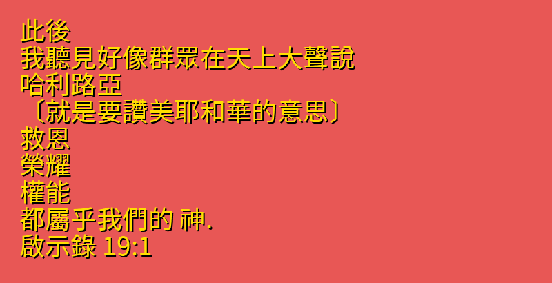 - 19:1 此後、我聽見好像群眾在天上大聲說、哈利路亞、〔就是要讚美耶和華的意思〕救恩、榮耀、權能、都屬乎我們的 神.