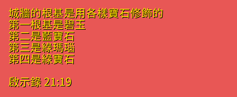 城牆的根基是用各樣寶石修飾的。第一根基是碧玉.第二是藍寶石.第三是綠瑪瑙.第四是綠寶石.