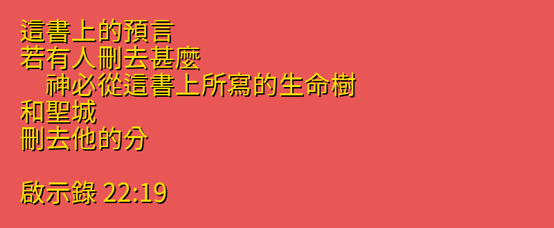 這書上的預言、若有人刪去甚麼、 神必從這書上所寫的生命樹、和聖城、刪去他的分。
