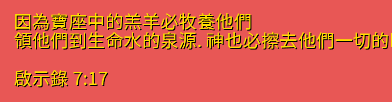 因為寶座中的羔羊必牧養他們、領他們到生命水的泉源. 神也必擦去他們一切的眼淚。