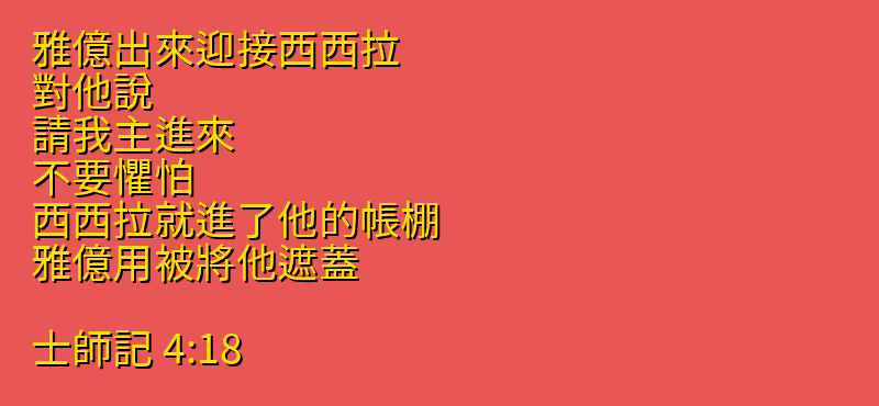 雅億出來迎接西西拉、對他說、請我主進來、不要懼怕.西西拉就進了他的帳棚.雅億用被將他遮蓋。