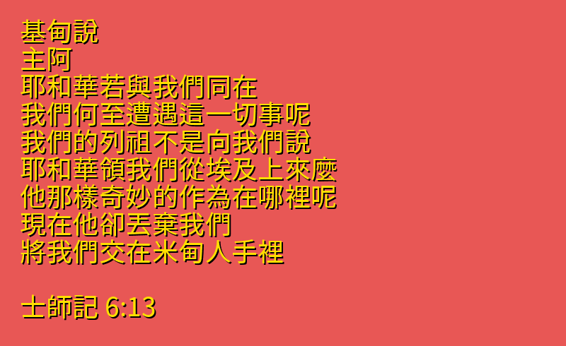 • 6:13 基甸說、主阿、耶和華若與我們同在、我們何至遭遇這一切事呢.我們的列祖不是向我們說、耶和華領我們從埃及上來麼.他那樣奇妙的作為在哪裡呢.現在他卻丟棄我們、將我們交在米甸人手裡。