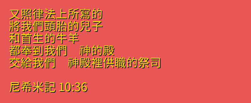 又照律法上所寫的、將我們頭胎的兒子、和首生的牛羊、都奉到我們 神的殿、交給我們 神殿裡供職的祭司.