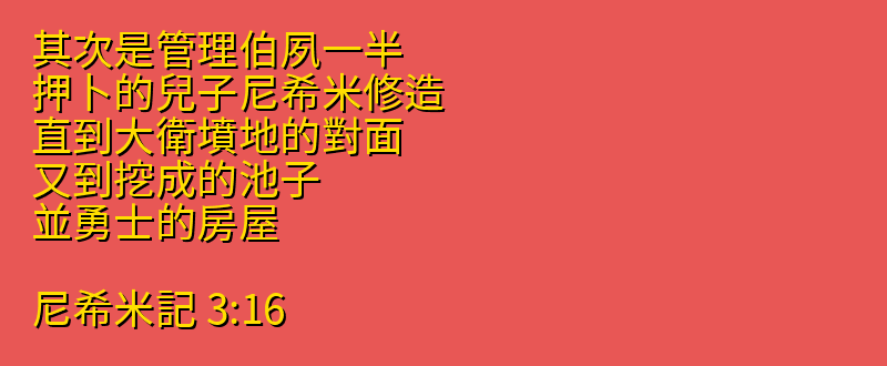 今日分享的中文聖經:「其次是管理伯夙一半、押卜的兒子尼希米修造、直到大衛墳地的對面、又到挖成的池子、並勇士的房屋。」來自聖經「尼希米記」第「3章16節」,你可以繼續向下拉看到聖經卷書完整章節。每日中文聖經從神的話語中聆聽神的聲音,引導我們的人生,指導我們人生的方向,讓我們做出正確的選擇,而做出這些正確選擇的原則都在聖經中,所以我們需要讀神的話語,認識他的話語,把神的話語藏在心裡。