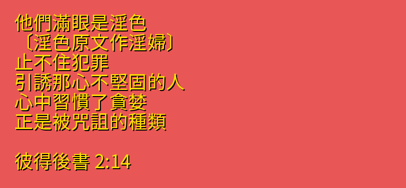 他們滿眼是淫色、〔淫色原文作淫婦〕止不住犯罪.引誘那心不堅固的人、心中習慣了貪婪、正是被咒詛的種類.