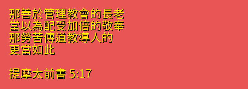 • 5:17 那善於管理教會的長老、當以為配受加倍的敬奉.那勞苦傳道教導人的、更當如此。