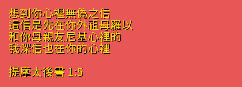 想到你心裡無偽之信.這信是先在你外祖母羅以、和你母親友尼基心裡的.我深信也在你的心裡。