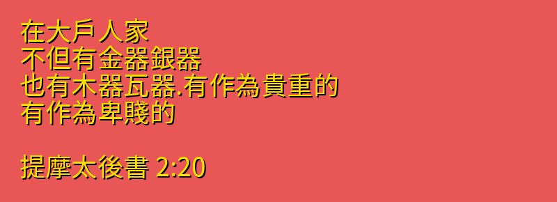 今日分享的中文聖經:「在大戶人家、不但有金器銀器、也有木器瓦器.有作為貴重的、有作為卑賤的。」來自聖經「提摩太後書」第「2章20節」,你可以繼續向下拉看到聖經卷書完整章節。每日中文聖經從神的話語中聆聽神的聲音,引導我們的人生,指導我們人生的方向,讓我們做出正確的選擇,而做出這些正確選擇的原則都在聖經中,所以我們需要讀神的話語,認識他的話語,把神的話語藏在心裡。