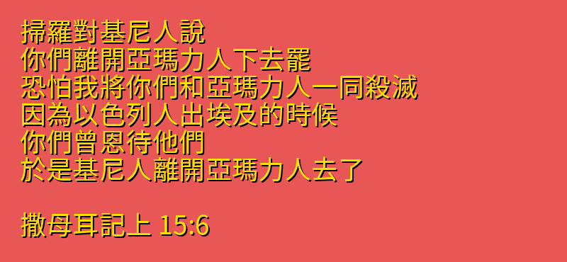 掃羅對基尼人說、你們離開亞瑪力人下去罷、恐怕我將你們和亞瑪力人一同殺滅.因為以色列人出埃及的時候、你們曾恩待他們.於是基尼人離開亞瑪力人去了。