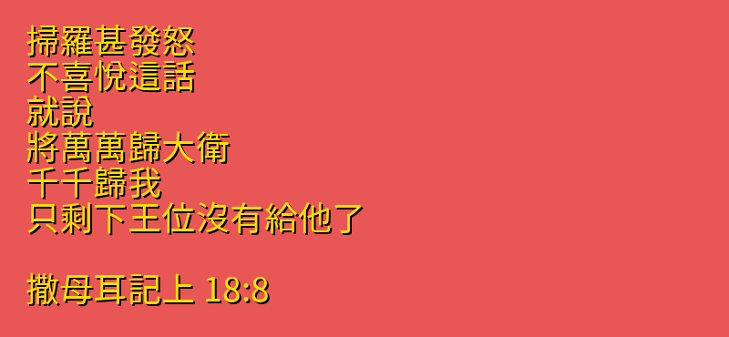 掃羅甚發怒、不喜悅這話、就說、將萬萬歸大衛、千千歸我、只剩下王位沒有給他了。