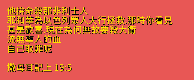 他拚命殺那非利士人、耶和華為以色列眾人大行拯救.那時你看見、甚是歡喜.現在為何無故要殺大衛、流無辜人的血、自己取罪呢。