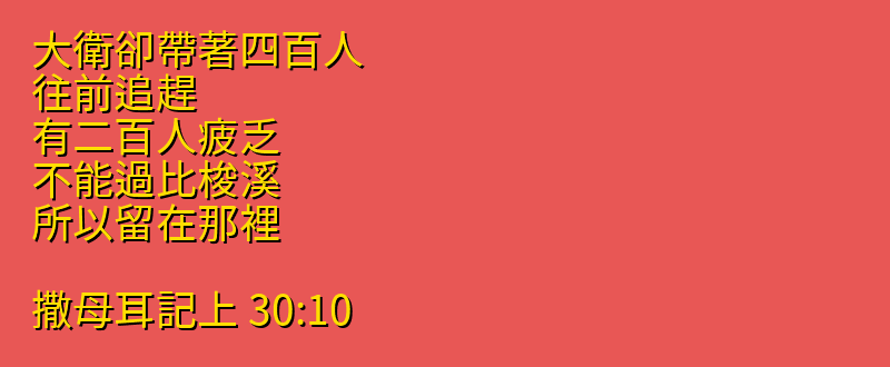 大衛卻帶著四百人、往前追趕.有二百人疲乏、不能過比梭溪、所以留在那裡。