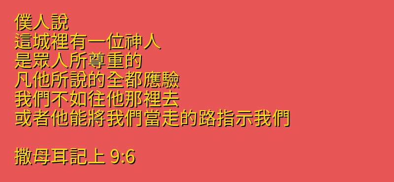 今日分享的中文聖經:「僕人說、這城裡有一位神人、是眾人所尊重的、凡他所說的全都應驗.我們不如往他那裡去、或者他能將我們當走的路指示我們。」來自聖經「撒母耳記上」第「9章6節」,你可以繼續向下拉看到聖經卷書完整章節。每日中文聖經從神的話語中聆聽神的聲音,引導我們的人生,指導我們人生的方向,讓我們做出正確的選擇,而做出這些正確選擇的原則都在聖經中,所以我們需要讀神的話語,認識他的話語,把神的話語藏在心裡。