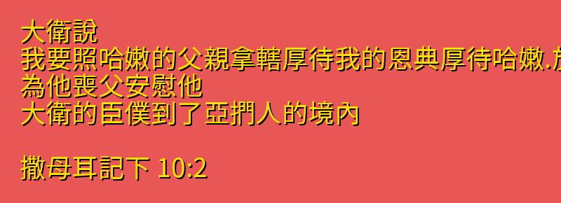 大衛說、我要照哈嫩的父親拿轄厚待我的恩典厚待哈嫩.於是大衛差遣臣僕、為他喪父安慰他。大衛的臣僕到了亞捫人的境內。