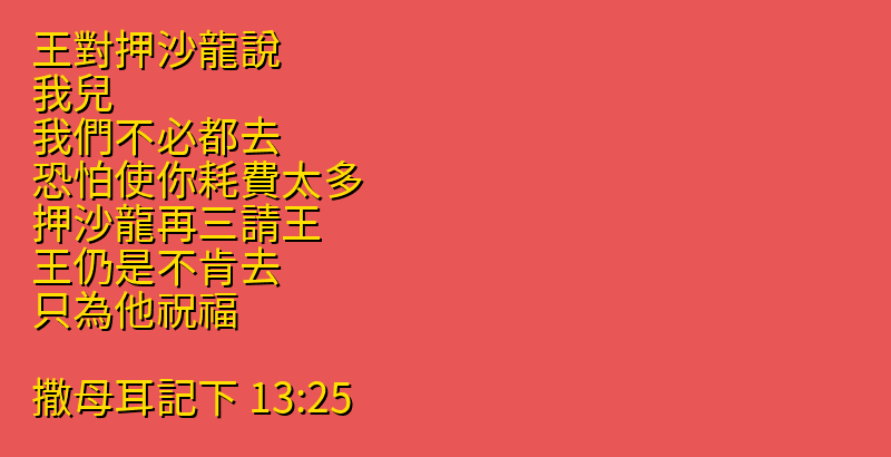 王對押沙龍說、我兒、我們不必都去、恐怕使你耗費太多。押沙龍再三請王.王仍是不肯去、只為他祝福。