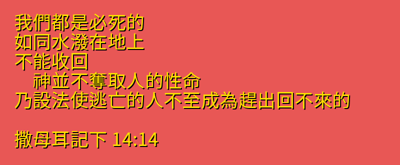 我們都是必死的、如同水潑在地上、不能收回. 神並不奪取人的性命、乃設法使逃亡的人不至成為趕出回不來的。