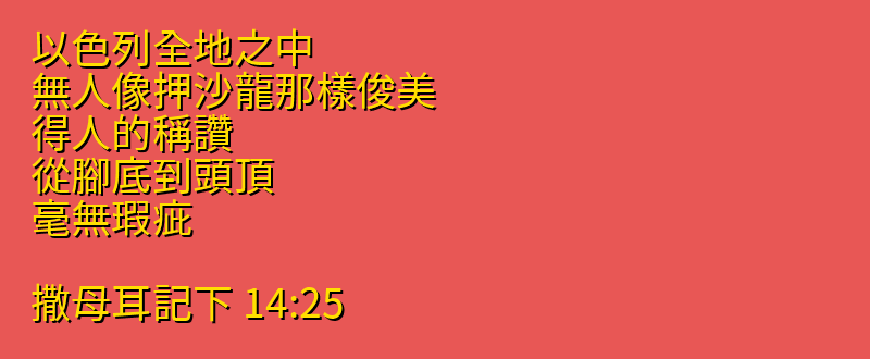 以色列全地之中、無人像押沙龍那樣俊美、得人的稱讚.從腳底到頭頂、毫無瑕疵。