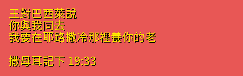 今日分享的中文聖經:「王對巴西萊說、你與我同去、我要在耶路撒冷那裡養你的老。」來自聖經「撒母耳記下」第「19章33節」,你可以繼續向下拉看到聖經卷書完整章節。每日中文聖經從神的話語中聆聽神的聲音,引導我們的人生,指導我們人生的方向,讓我們做出正確的選擇,而做出這些正確選擇的原則都在聖經中,所以我們需要讀神的話語,認識他的話語,把神的話語藏在心裡。