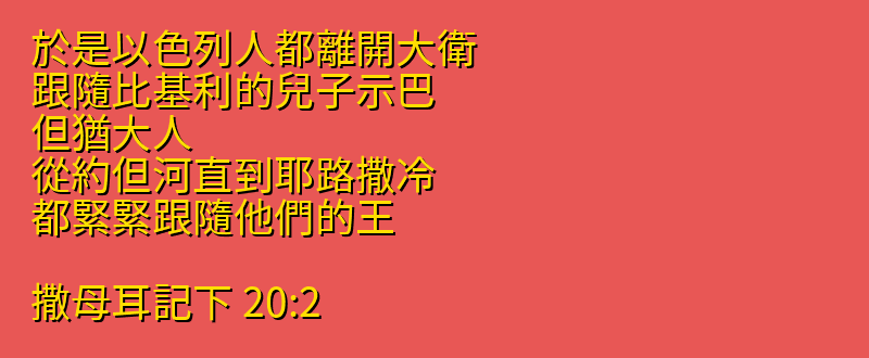 今日分享的中文聖經:「於是以色列人都離開大衛、跟隨比基利的兒子示巴.但猶大人、從約但河直到耶路撒冷、都緊緊跟隨他們的王。」來自聖經「撒母耳記下」第「20章2節」,你可以繼續向下拉看到聖經卷書完整章節。每日中文聖經從神的話語中聆聽神的聲音,引導我們的人生,指導我們人生的方向,讓我們做出正確的選擇,而做出這些正確選擇的原則都在聖經中,所以我們需要讀神的話語,認識他的話語,把神的話語藏在心裡。