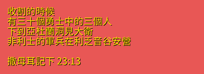 收割的時候、有三十個勇士中的三個人、下到亞杜蘭洞見大衛.非利士的軍兵在利乏音谷安營。
