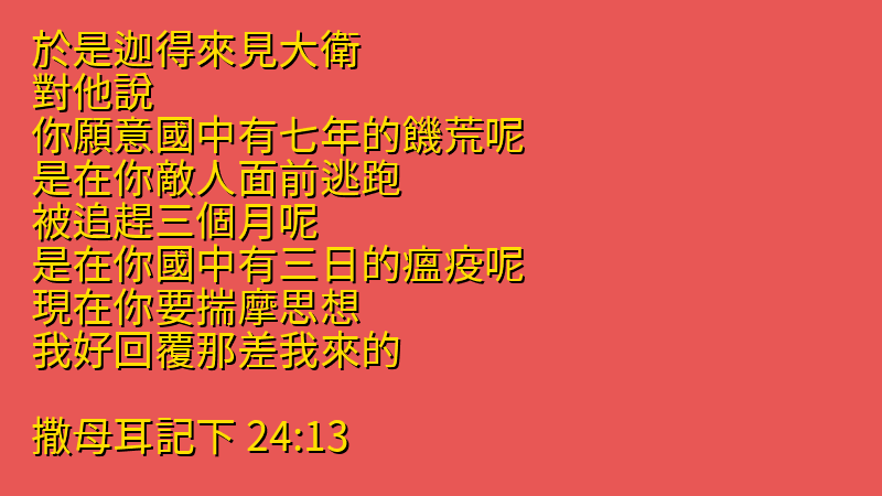 於是迦得來見大衛、對他說、你願意國中有七年的饑荒呢.是在你敵人面前逃跑、被追趕三個月呢.是在你國中有三日的瘟疫呢.現在你要揣摩思想、我好回覆那差我來的。