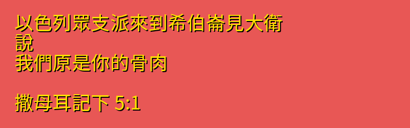 - 5:1 以色列眾支派來到希伯崙見大衛、說、我們原是你的骨肉。