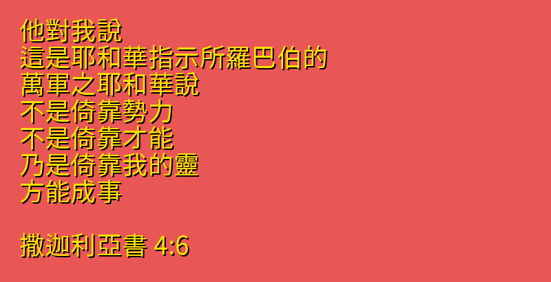 他對我說、這是耶和華指示所羅巴伯的.萬軍之耶和華說、不是倚靠勢力、不是倚靠才能、乃是倚靠我的靈、方能成事。