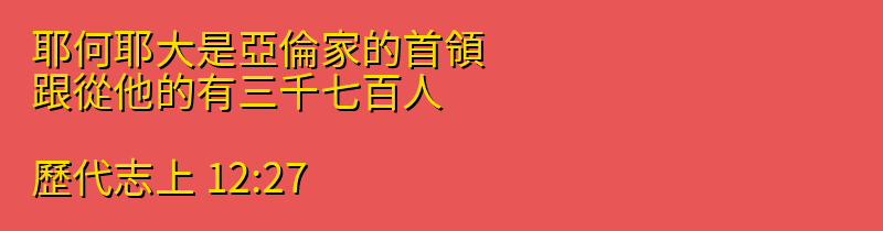 今日分享的中文聖經:「耶何耶大是亞倫家的首領.跟從他的有三千七百人.」來自聖經「歷代志上」第「12章27節」,你可以繼續向下拉看到聖經卷書完整章節。每日中文聖經從神的話語中聆聽神的聲音,引導我們的人生,指導我們人生的方向,讓我們做出正確的選擇,而做出這些正確選擇的原則都在聖經中,所以我們需要讀神的話語,認識他的話語,把神的話語藏在心裡。