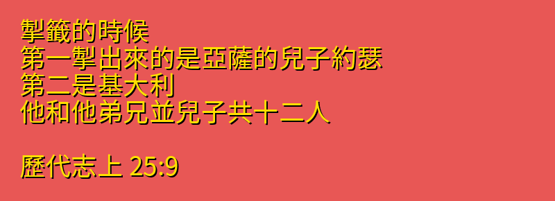 掣籤的時候、第一掣出來的是亞薩的兒子約瑟.第二是基大利、他和他弟兄並兒子共十二人。