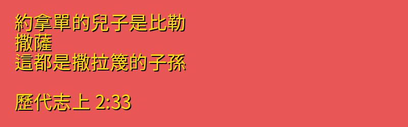 今日分享的中文聖經:「約拿單的兒子是比勒、撒薩.這都是撒拉篾的子孫。」來自聖經「歷代志上」第「2章33節」,你可以繼續向下拉看到聖經卷書完整章節。每日中文聖經從神的話語中聆聽神的聲音,引導我們的人生,指導我們人生的方向,讓我們做出正確的選擇,而做出這些正確選擇的原則都在聖經中,所以我們需要讀神的話語,認識他的話語,把神的話語藏在心裡。