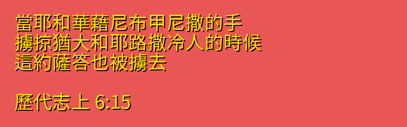 今日分享的中文聖經:「當耶和華藉尼布甲尼撒的手、擄掠猶大和耶路撒冷人的時候、這約薩答也被擄去。」來自聖經「歷代志上」第「6章15節」,你可以繼續向下拉看到聖經卷書完整章節。每日中文聖經從神的話語中聆聽神的聲音,引導我們的人生,指導我們人生的方向,讓我們做出正確的選擇,而做出這些正確選擇的原則都在聖經中,所以我們需要讀神的話語,認識他的話語,把神的話語藏在心裡。