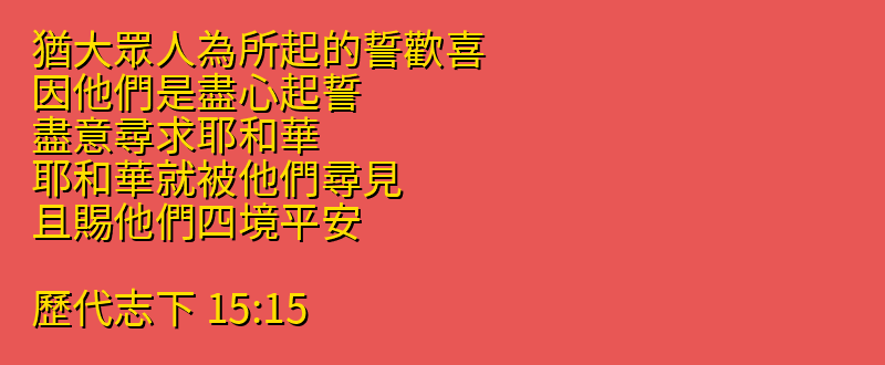 猶大眾人為所起的誓歡喜.因他們是盡心起誓、盡意尋求耶和華、耶和華就被他們尋見、且賜他們四境平安。