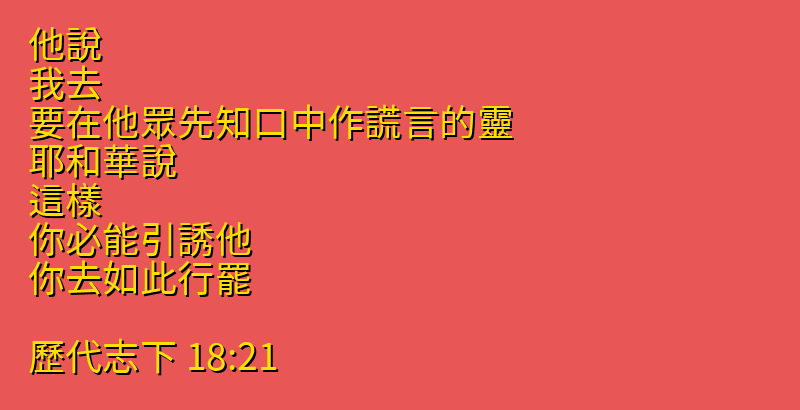 今日分享的中文聖經:「他說、我去、要在他眾先知口中作謊言的靈。耶和華說、這樣、你必能引誘他.你去如此行罷。」來自聖經「歷代志下」第「18章21節」,你可以繼續向下拉看到聖經卷書完整章節。每日中文聖經從神的話語中聆聽神的聲音,引導我們的人生,指導我們人生的方向,讓我們做出正確的選擇,而做出這些正確選擇的原則都在聖經中,所以我們需要讀神的話語,認識他的話語,把神的話語藏在心裡。