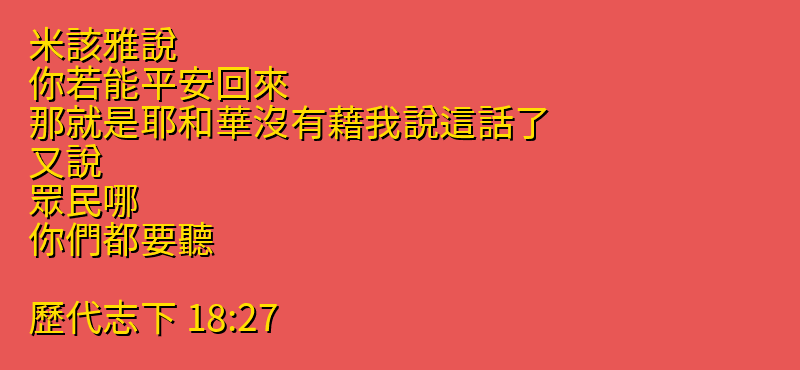 今日分享的中文聖經:「米該雅說、你若能平安回來、那就是耶和華沒有藉我說這話了.又說、眾民哪、你們都要聽。」來自聖經「歷代志下」第「18章27節」,你可以繼續向下拉看到聖經卷書完整章節。每日中文聖經從神的話語中聆聽神的聲音,引導我們的人生,指導我們人生的方向,讓我們做出正確的選擇,而做出這些正確選擇的原則都在聖經中,所以我們需要讀神的話語,認識他的話語,把神的話語藏在心裡。