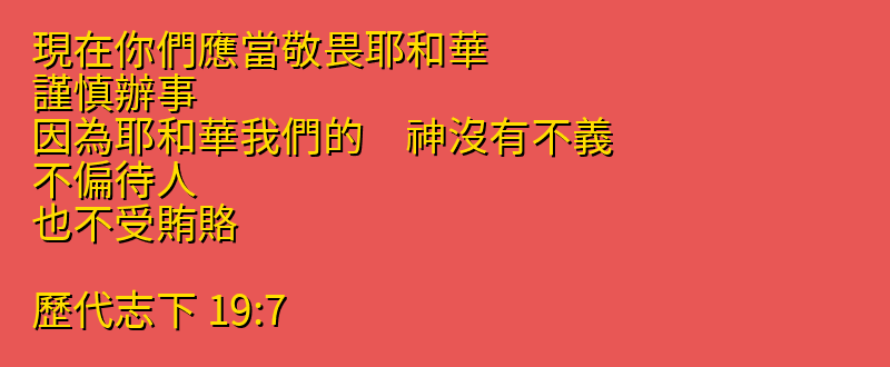 現在你們應當敬畏耶和華.謹慎辦事.因為耶和華我們的 神沒有不義、不偏待人、也不受賄賂。