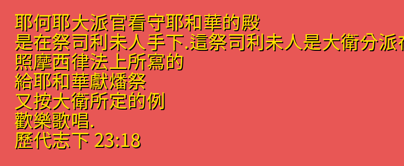 今日分享的中文聖經:「耶何耶大派官看守耶和華的殿、是在祭司利未人手下.這祭司利未人是大衛分派在耶和華殿中、照摩西律法上所寫的、給耶和華獻燔祭、又按大衛所定的例、歡樂歌唱.」來自聖經「歷代志下」第「23章18節」,你可以繼續向下拉看到聖經卷書完整章節。每日中文聖經從神的話語中聆聽神的聲音,引導我們的人生,指導我們人生的方向,讓我們做出正確的選擇,而做出這些正確選擇的原則都在聖經中,所以我們需要讀神的話語,認識他的話語,把神的話語藏在心裡。