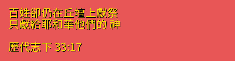 今日分享的中文聖經:「百姓卻仍在丘壇上獻祭、只獻給耶和華他們的 神。」來自聖經「歷代志下」第「33章17節」,你可以繼續向下拉看到聖經卷書完整章節。每日中文聖經從神的話語中聆聽神的聲音,引導我們的人生,指導我們人生的方向,讓我們做出正確的選擇,而做出這些正確選擇的原則都在聖經中,所以我們需要讀神的話語,認識他的話語,把神的話語藏在心裡。