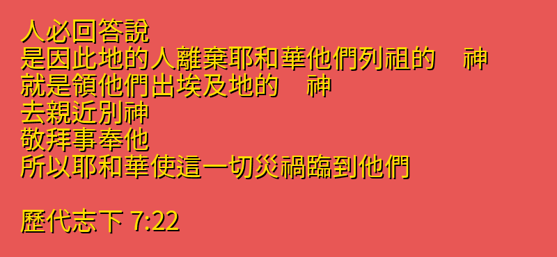 您對於歷代志下聖經「人必回答說、是因此地的人離棄耶和華他們列祖的 神、就是領他們出埃及地的 神、去親近別神、敬拜事奉他.所以耶和華使這一切災禍臨到他們。」有何comment?
