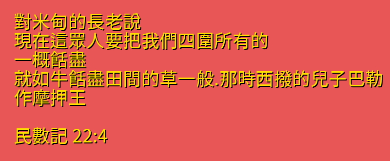 今日分享的中文聖經:「對米甸的長老說、現在這眾人要把我們四圍所有的、一概餂盡、就如牛餂盡田間的草一般.那時西撥的兒子巴勒、作摩押王。」來自聖經「民數記」第「22章4節」,你可以繼續向下拉看到聖經卷書完整章節。每日中文聖經從神的話語中聆聽神的聲音,引導我們的人生,指導我們人生的方向,讓我們做出正確的選擇,而做出這些正確選擇的原則都在聖經中,所以我們需要讀神的話語,認識他的話語,把神的話語藏在心裡。