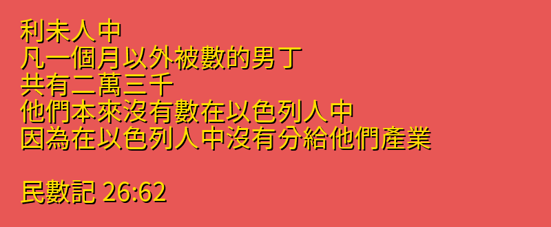 利未人中、凡一個月以外被數的男丁、共有二萬三千.他們本來沒有數在以色列人中.因為在以色列人中沒有分給他們產業。