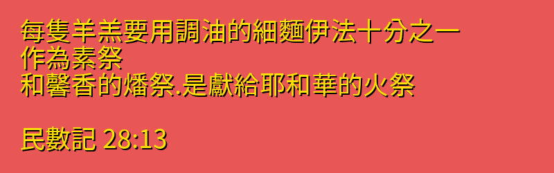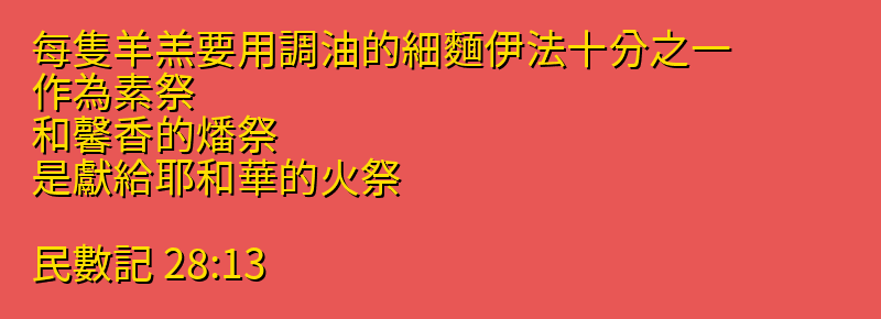 • 28:13 每隻羊羔要用調油的細麵伊法十分之一、作為素祭、和馨香的燔祭.是獻給耶和華的火祭。