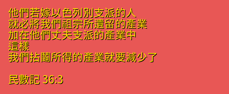 他們若嫁以色列別支派的人、就必將我們祖宗所遺留的產業、加在他們丈夫支派的產業中.這樣、我們拈鬮所得的產業就要減少了。